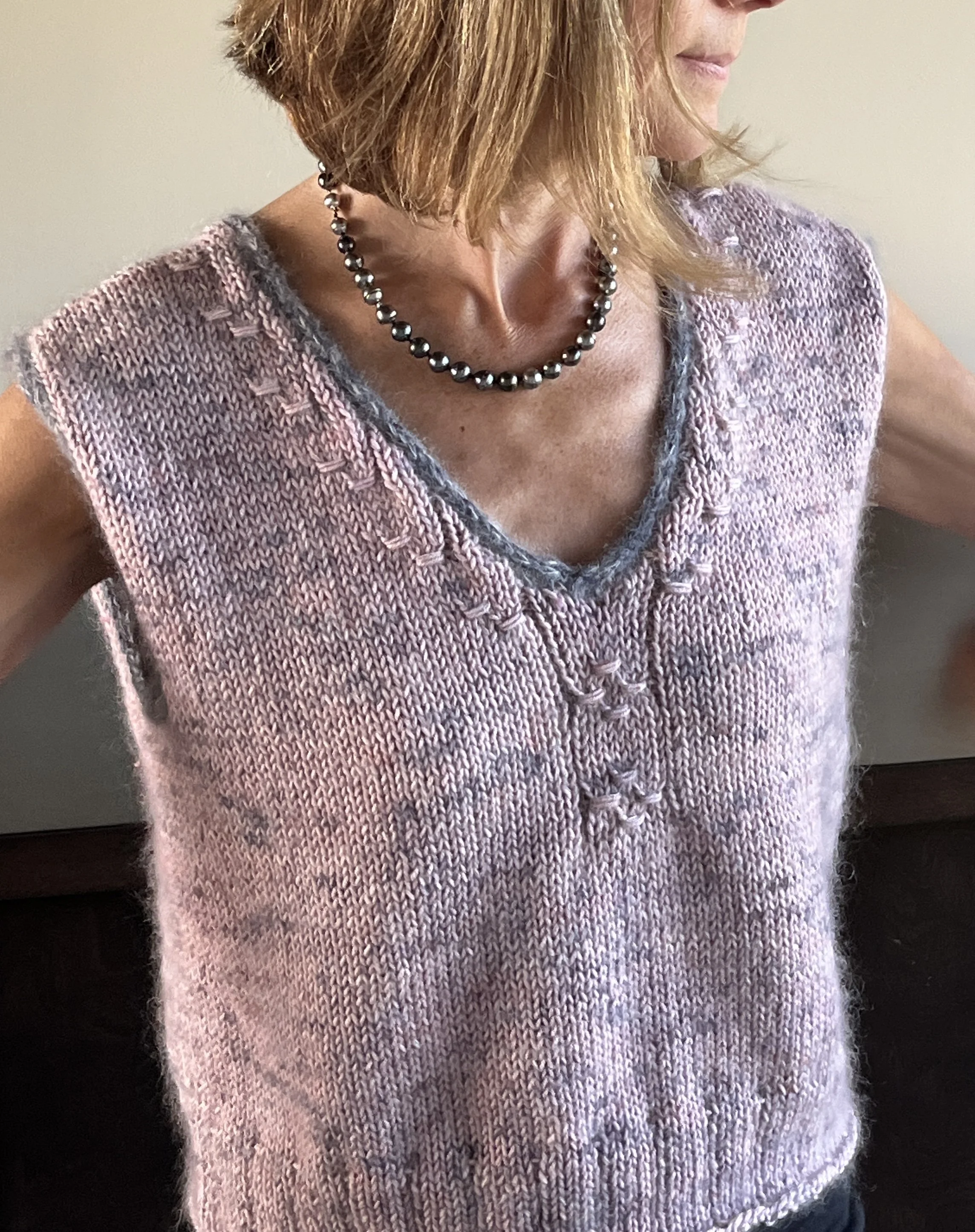 Métrage laine B : 510 (575, 635, 730, 795) (905, 985, 1080) m. de Emilia & Philomène- Leona (72 % mohair, 28 % soie. 459 m / 50 g) Coloris « Kalambaka ».