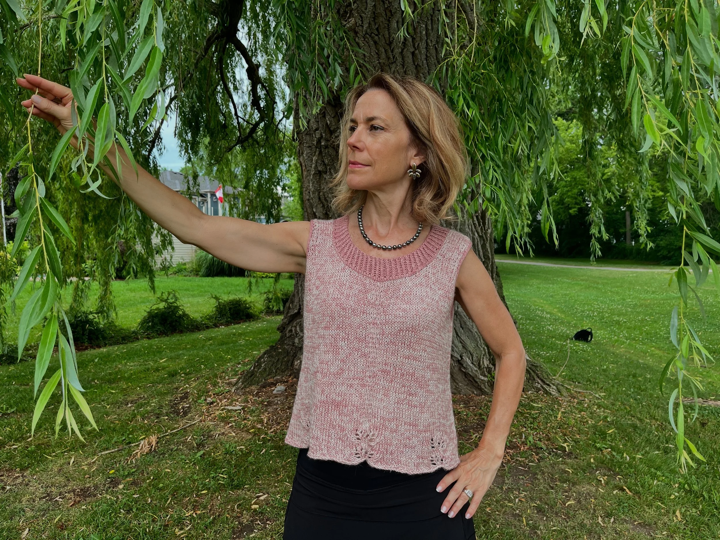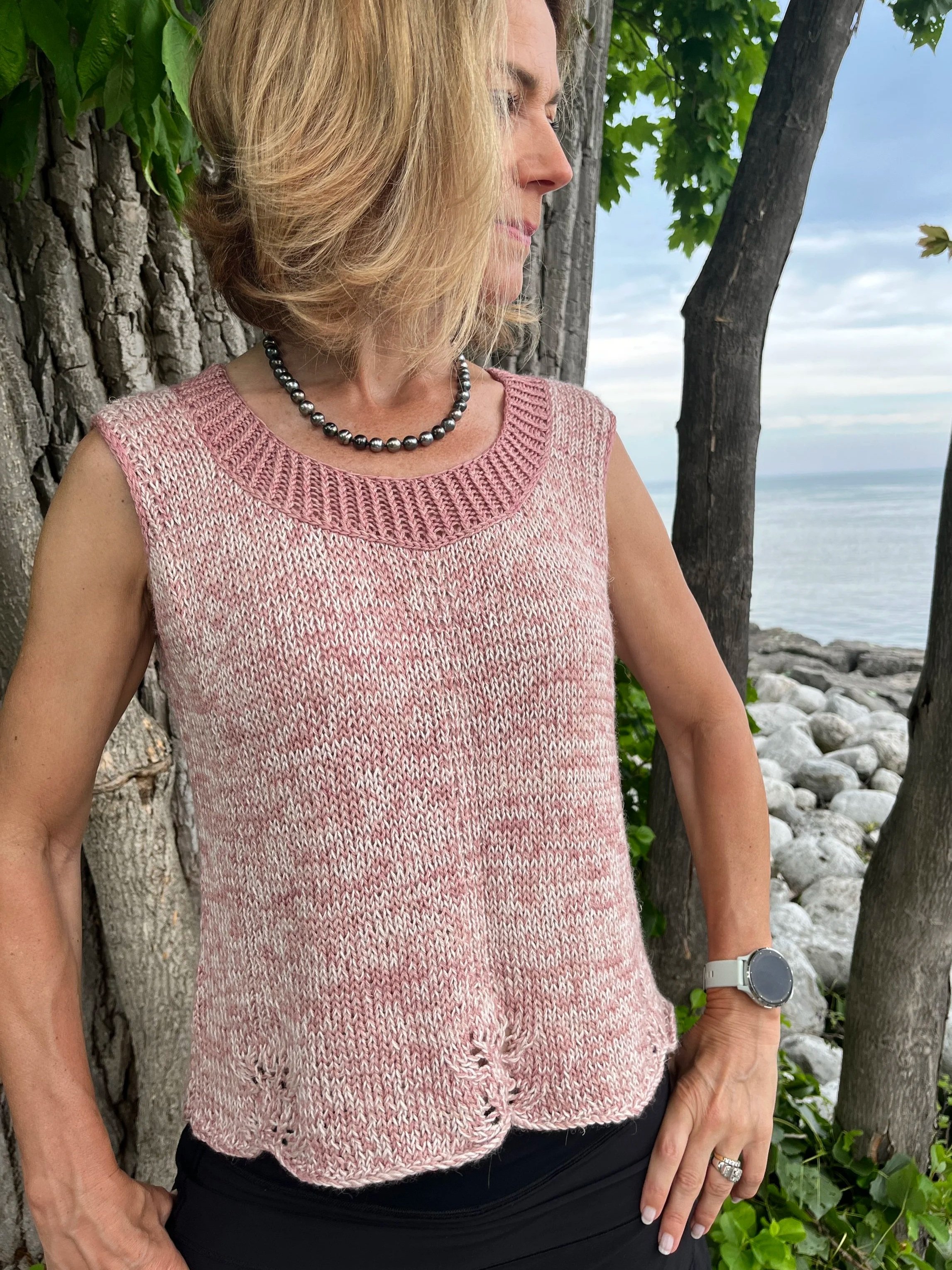 Une camisole en deux panneaux où légèreté et raffinement s'entrelacent naturellement. Les côtes estoniennes bordant l'encolure généreuse et les emmanchures dessinent la silhouette avec une précision tranquille. Le bas orné de dentelle fine prolonge l'ensemble dans une grâce discrète — ce détail rare fait de Soléna une pièce à part.