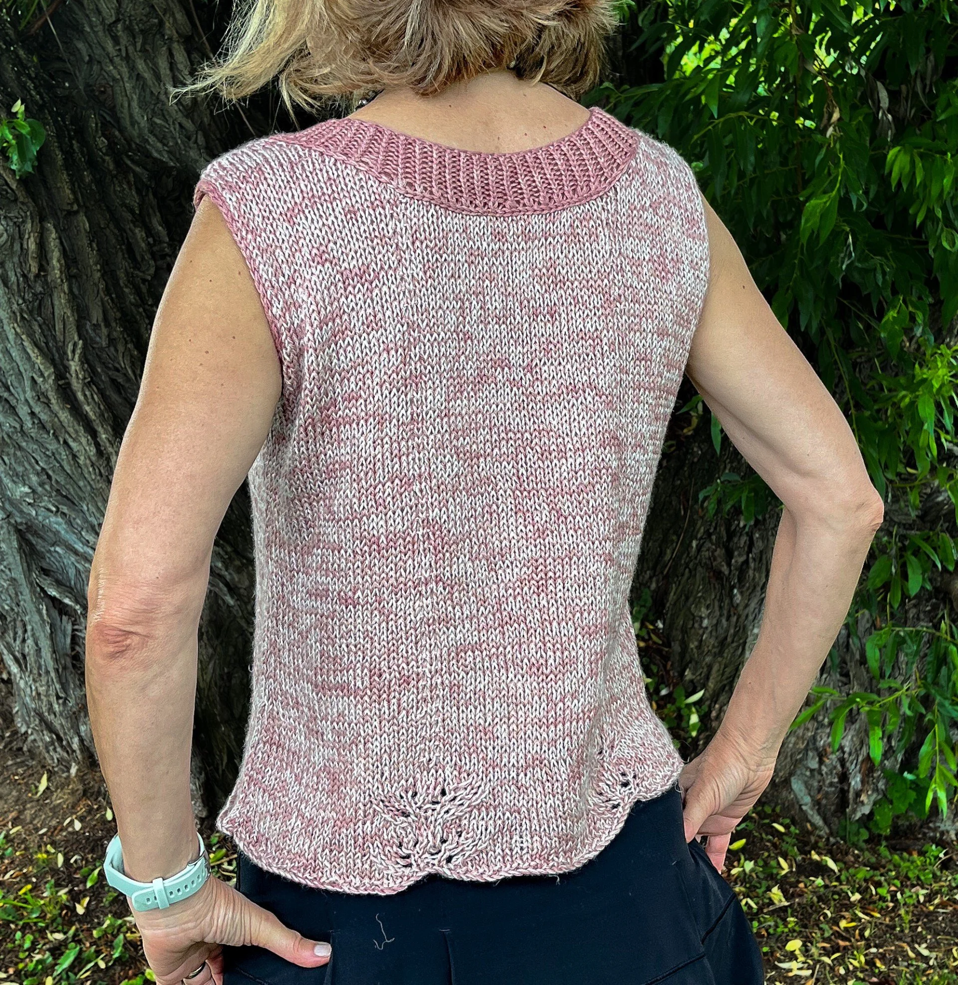 Tricotée en rond, sans couture, du bas vers le haut. Au niveau des emmanchures, le travail se sépare pour tricoter le dos et le devant distinctement.